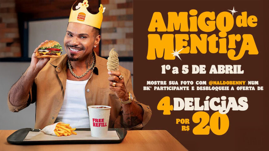 O Burger King escolheu um caminho alinhado ao humor e ao contexto cultural do 1º de abril para lançar sua nova campanha no Brasil. A marca convidou Naldo Benny, figura que se consolidou nas redes sociais por suas histórias exageradas, para protagonizar a ação e assumir o papel de “amigo de mentira”.