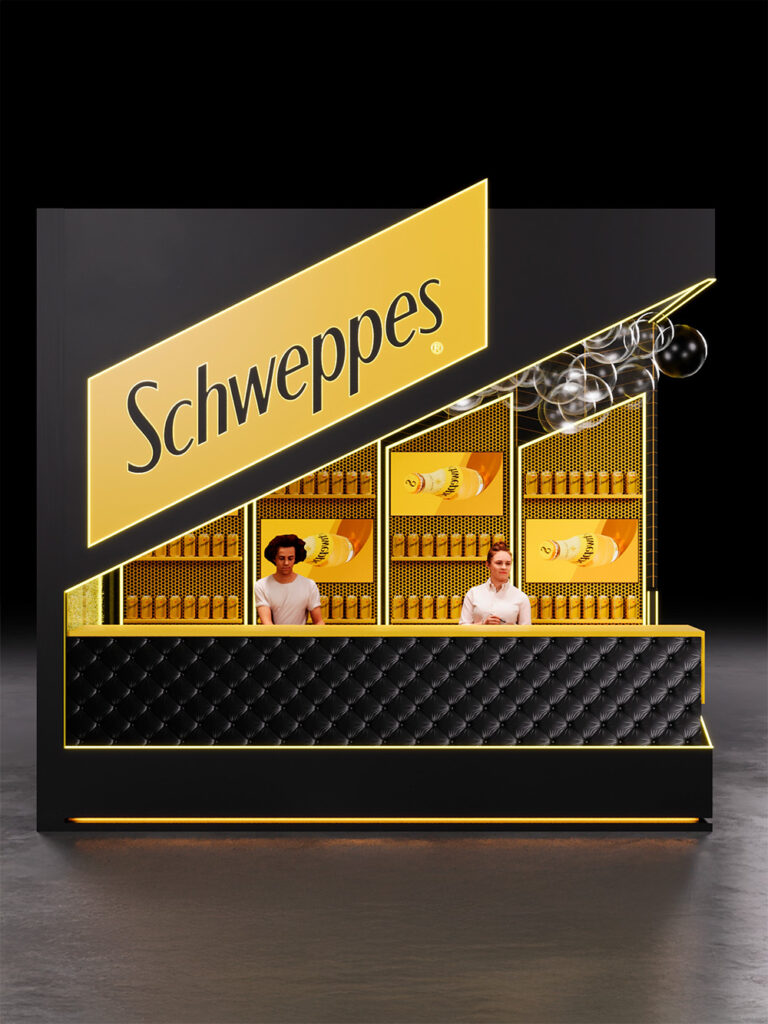 Já a Schweppes aposta em um bar premium de drinks, onde seu portfólio se torna protagonista em diferentes combinações. A cenografia reforça o universo da marca e convida o público a explorar novos sabores, enquanto ativações complementares incluem brindes como óculos escuros personalizados.