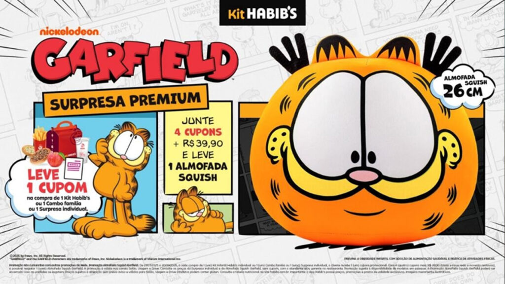 Além das luminárias, a campanha inclui um item premium: uma almofada squish do Garfield em edição limitada. Para resgatar o produto, o cliente precisa juntar quatro cupons recebidos na compra de kit infantil, combo família ou surpresa avulsa e pagar R$ 39,90. Sem cupons, a almofada pode ser adquirida nas lojas por R$ 69,90.