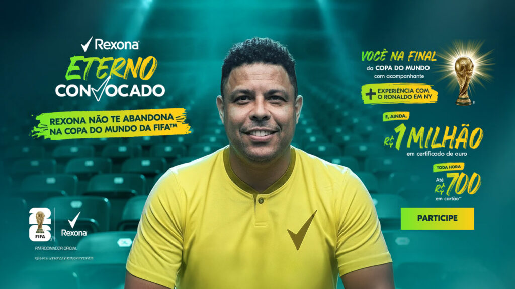Como parte do ecossistema da campanha, a Rexona também lança a promoção “Eterno Convocado”, que vai levar cinco consumidores para assistir à final da Copa do Mundo FIFA 2026 nos Estados Unidos com tudo pago, incluindo a possibilidade de levar um acompanhante. A experiência inclui ainda a presença de Ronaldo Fenômeno, ampliando o valor simbólico da ação.