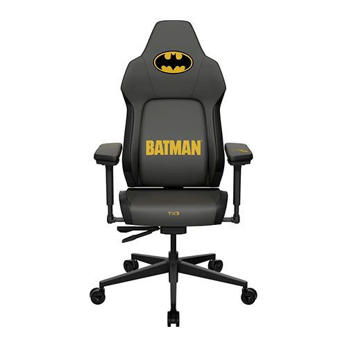 O modelo Batman traz a atmosfera sombria de Gotham para o setup, com um design que usa contrastes e iconografia inspirada no Cavaleiro das Trevas. O símbolo clássico aparece em destaque no apoio de cabeça, enquanto os detalhes aplicados no estofamento e nos braços remetem ao arsenal e ao estilo de combate do herói, criando um visual elegante e misterioso ao mesmo tempo.
