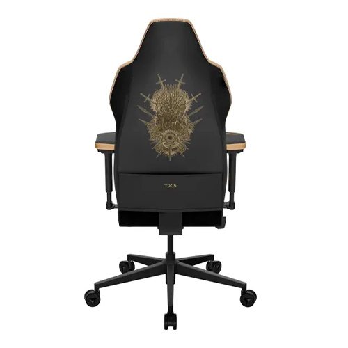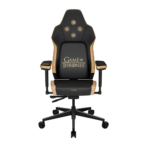 A cadeira inspirada em Game of Thrones coloca o Trono de Ferro no centro do design, com uma paleta que combina preto e dourado e detalhes em baixo-relevo que destacam os símbolos das principais casas de Westeros. A parte traseira do encosto traz uma ilustração imponente do Trono de Ferro, enquanto os apoios reforçam o clima de poder e disputa, traduzindo o universo da série para um produto colecionável.