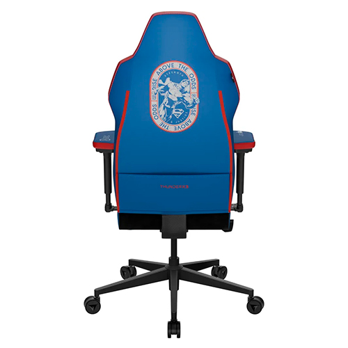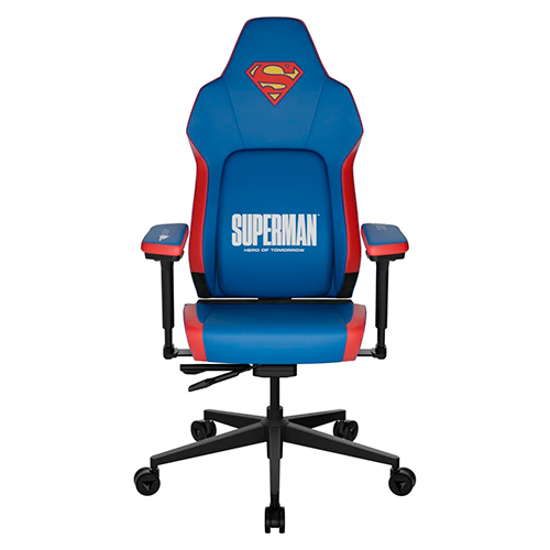 A cadeira Superman aposta em um visual clássico e imponente, com uma paleta que combina o azul e o vermelho tradicionais do herói, além de detalhes icônicos aplicados no encosto e no apoio de cabeça. O escudo minimalista remete ao instante da transformação de Clark Kent, enquanto a parte traseira do encosto exibe um emblema nostálgico da era de ouro dos quadrinhos, reforçando a sensação de um trono digno do Homem de Aço.